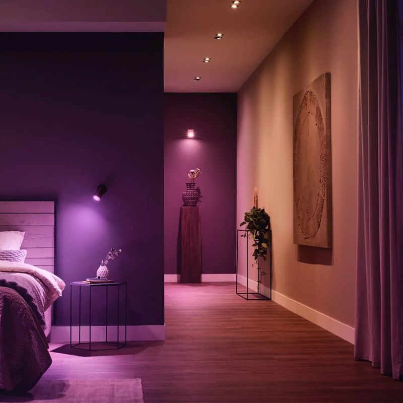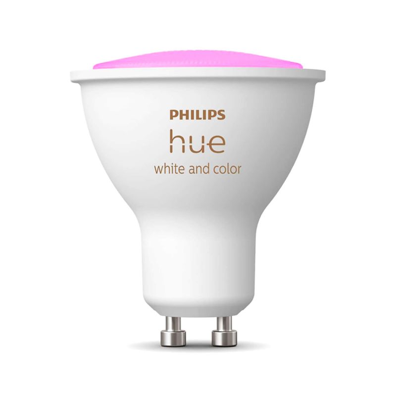 Ampolleta Philips Hue de formato GU10. Ideal para iluminar los espacios de tu hogar. Permite controlar los escenarios que desees a través de app o control de voz. Disponible en color blanco con consumo de 4.2W, luz cálida a fría y RGB. Compatible con Bluetooth y Bridge Hue. Mide Ø5 diámetro x 5,5 alto cm.