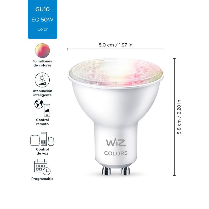 Ampolleta Wiz de formato GU10 con tecnología Wi-Fi inteligente. Ideal para iluminar los espacios de tu hogar. Disponible en color blanco con consumo de 4.7W, que equivale a 50W, entrega 400 lúmenes, con luz cálida a fría y RGB. Mide Ø5 diámetro x 5,5 alto cm.