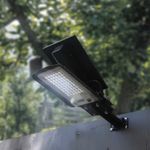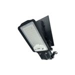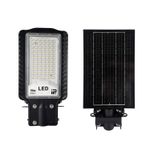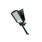 Luminaria solar Led Studio, incluye base para montaje en muro y control remoto. Ofrece 1000 lúmenes de iluminación, es resistente al agua y polvo gracias a su grado de protección IP65, y tiene una autonomía de 10-12 horas con un tiempo de recarga de 5-6 horas. Ideal para exteriores.