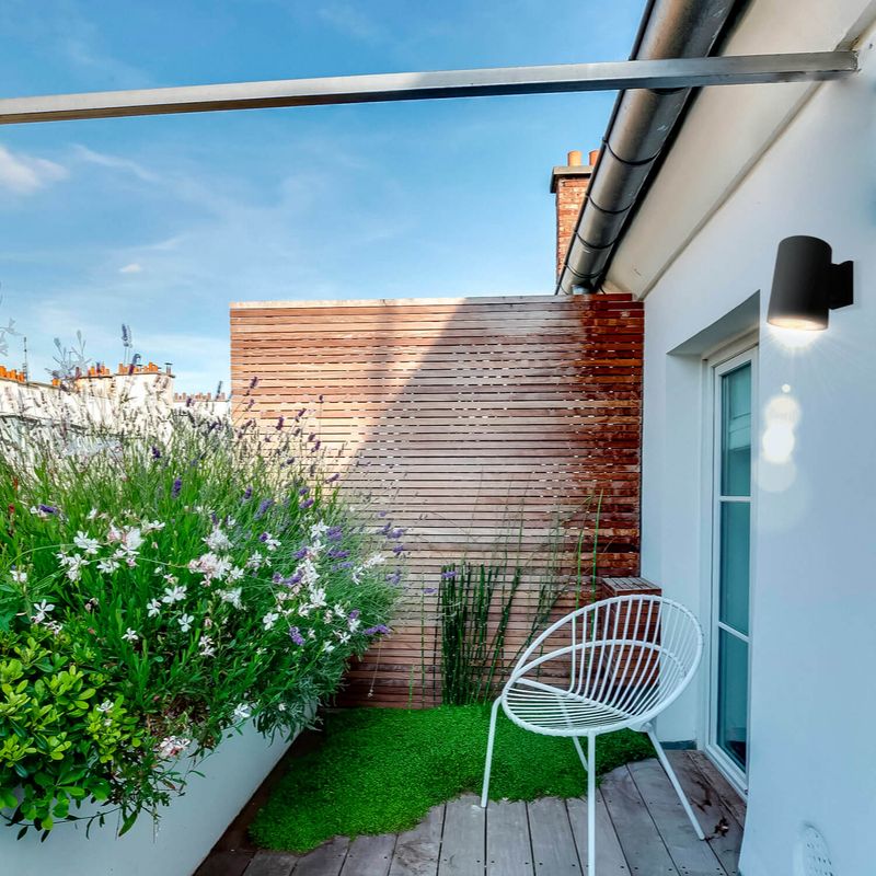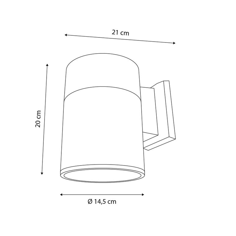 Apliqué de muro cilíndrico grande. Ideal para ser instalado en exteriores como terrazas, quinchos, jardines, pasillos, etc. Disponible en color negro con luz cálida. Mide Ø14,5 diámetro x 21 ancho x 20 alto cm.