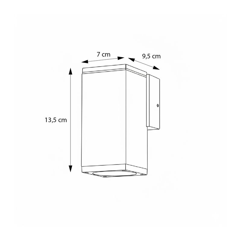 Apliqué mural de diseño rectangular y estilo moderno, ideal para iluminar y destacar muros en exteriores e interiores protegidos. Su emisión unifocal genera un efecto de luz definido y elegante, aportando carácter arquitectónico a cualquier espacio. Cuenta con protección IP54, resistente al polvo y salpicaduras. Perfecto para fachadas, terrazas y accesos. No incluye ampolleta GU10.