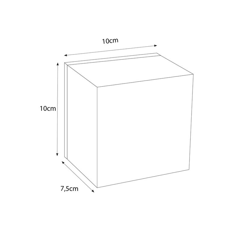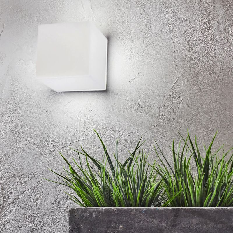 Apliqué de muro Bloc cuadrado. Ideal para ser instalado en exteriores como terrazas, quinchos, jardines, pasillos, etc. Disponible en color blanco con luz cálida, neutra y fría. Mide 10 largo x 7,5 ancho x 10 alto cm.