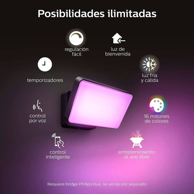 Ahora puedes ampliar la tecnología Hue a tus espacios exteriores. El proyector Discover de 15 watts de luz cálida a fría y RGB, puede conectarse a tu puente Hue existente para disfrutar de todas las funcionalidades que te dan una acogedora bienvenida a casa. Con millones de opciones de colores, también puedes crear cualquier ambiente. Necesita puente HUE.