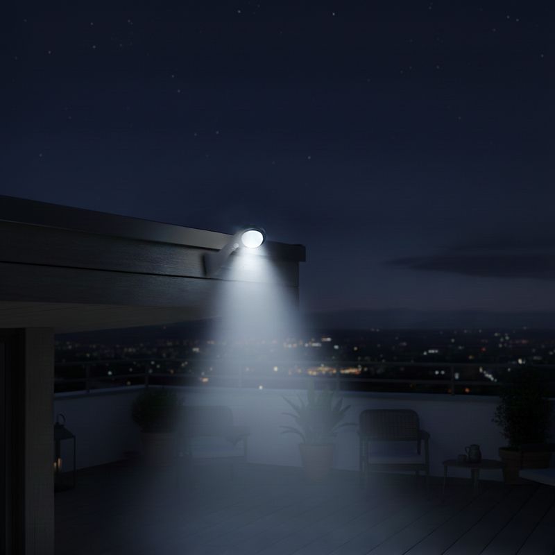 Apliqué solar de color negro, con modo de luz fría alta, baja y encendido por movimiento. Ideal para ser instalado en exterior ya que tiene protección IP65. Mide Ø8,5 diámetro x 19 ancho x 12 alto cm.