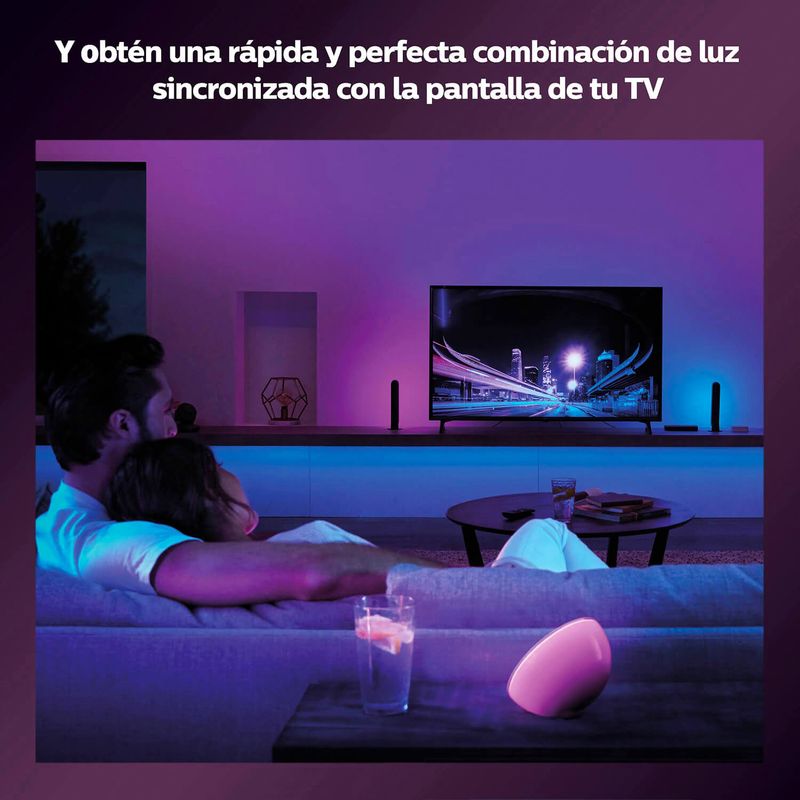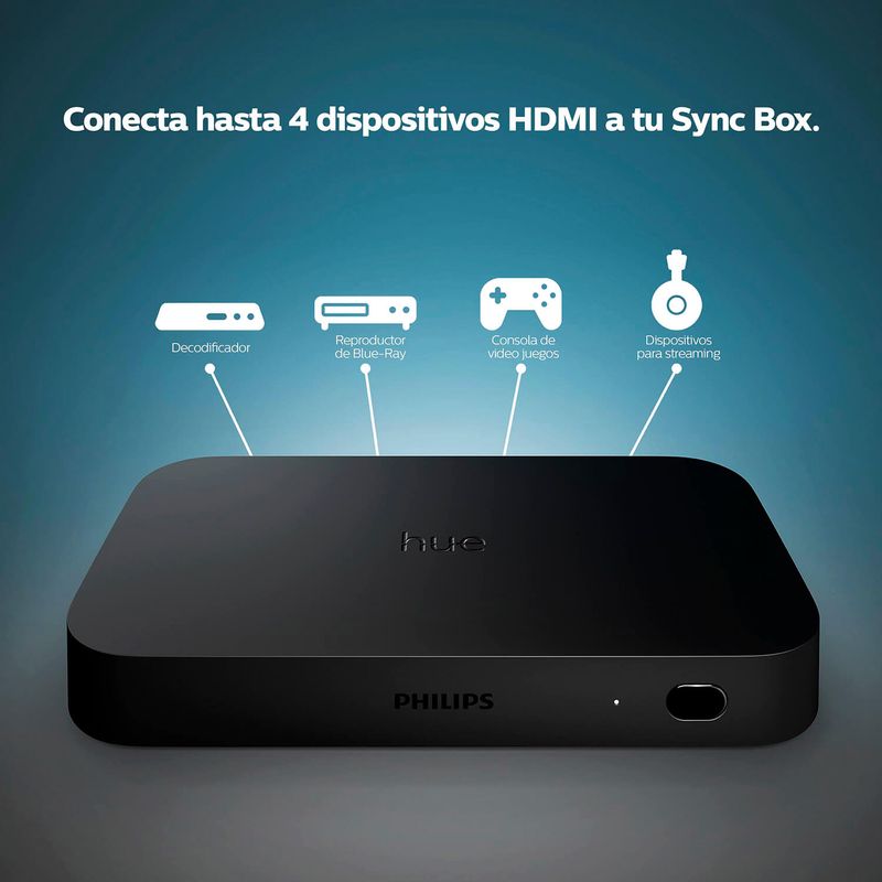 Con Philips Hue Play HDMI Sync Box, sincroniza tus luces inteligentes con la pantalla del televisor. Las cuatro entradas de HDMI te permiten conectar los dispositivos multimedia a tu configuración de Hue, logrando una experiencia visual de coloridas luces inteligentes que responden a lo que estás viendo o escuchando.