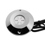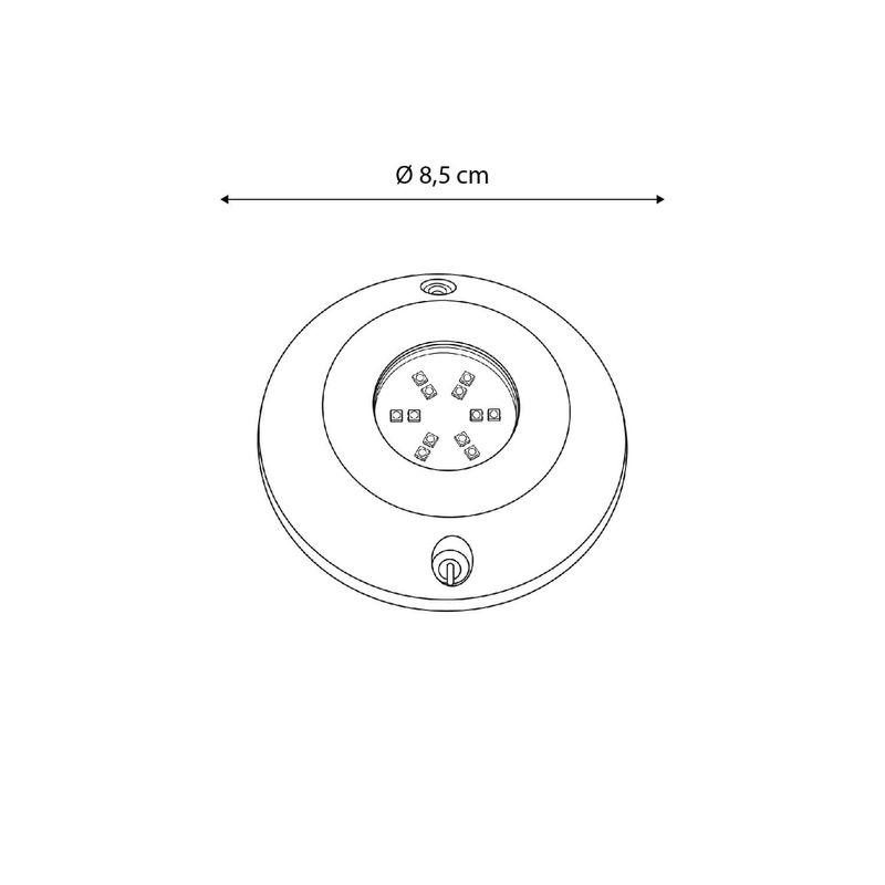 Foco sumergible Acqua dimeable. Ideal para ser instalado en exteriores como terrazas, quinchos, piscinas, piletas, etc. Requiere una fuente de poder de 12V y 60W (Ref: C191000005). Disponible en color plateado con luz RGB. Mide Ø8,5 diámetro x 1,5 alto cm.