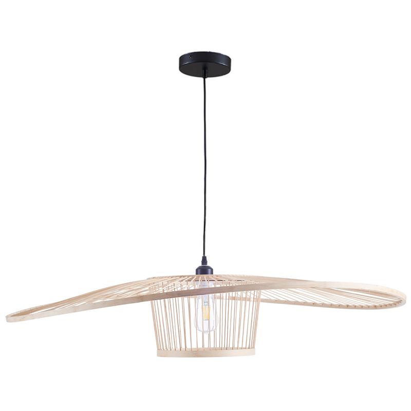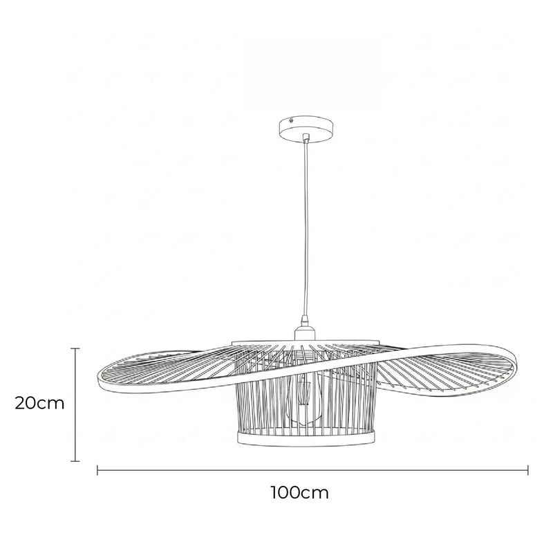 Haz una declaración de estilo con la lámpara Boina Grande, una pieza de iluminación de formato extra grande. Con un impresionante diametro de 100cm, esta lámpara presenta una estructura radial de varillas de bambú que se expanden de forma orgánica, evocando la silueta de un sombrero tradicional. Su diseño abierto permite una visibilidad total de la ampolleta, convirtiéndola en el complemento perfecto para bombillas decorativas tipo filamento. Incluye cordón (C33500019), no incluye ampolleta.