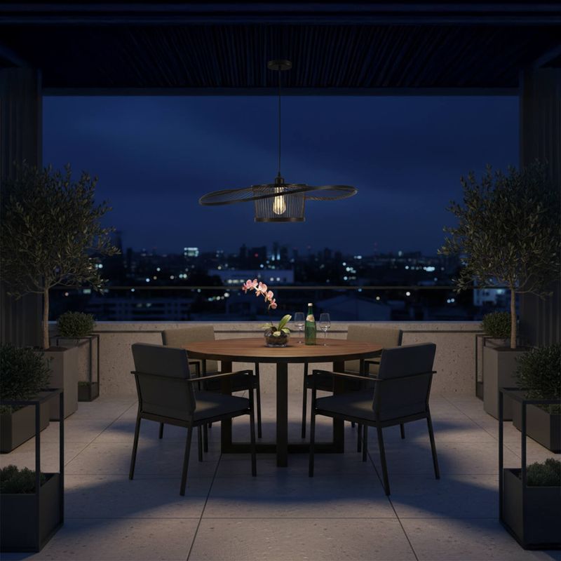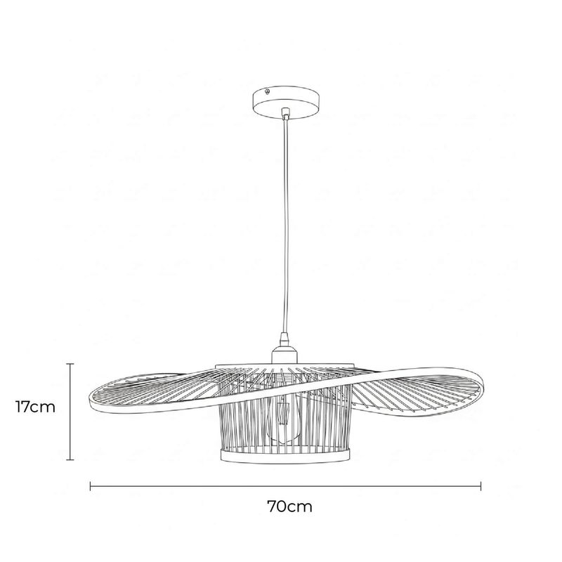 Haz una declaración de estilo con la lámpara Boina Mediana, una pieza de iluminación de formato extra grande. Con un impresionante diametro de 100cm, esta lámpara presenta una estructura radial de varillas de bambú que se expanden de forma orgánica, evocando la silueta de un sombrero tradicional. Su diseño abierto permite una visibilidad total de la ampolleta. Incluye cordón (C33500019), no incluye ampolleta.