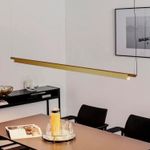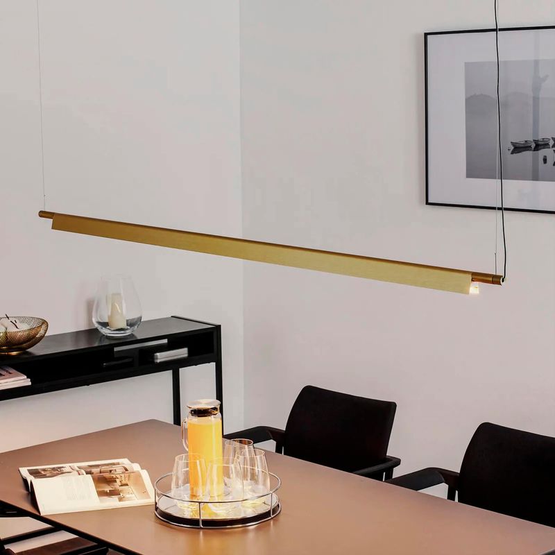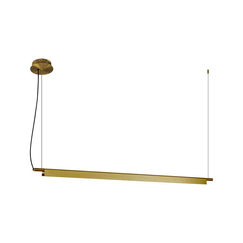 Su diseño lineal y elegante focaliza la luz únicamente hacia abajo, lo que la hace ideal para instalar sobre mesas de comedor o escritorios, proporcionando una iluminación focalizada sin deslumbrar. Su acabado en color dorado añade un toque de lujo y modernidad a tu decoración.