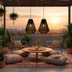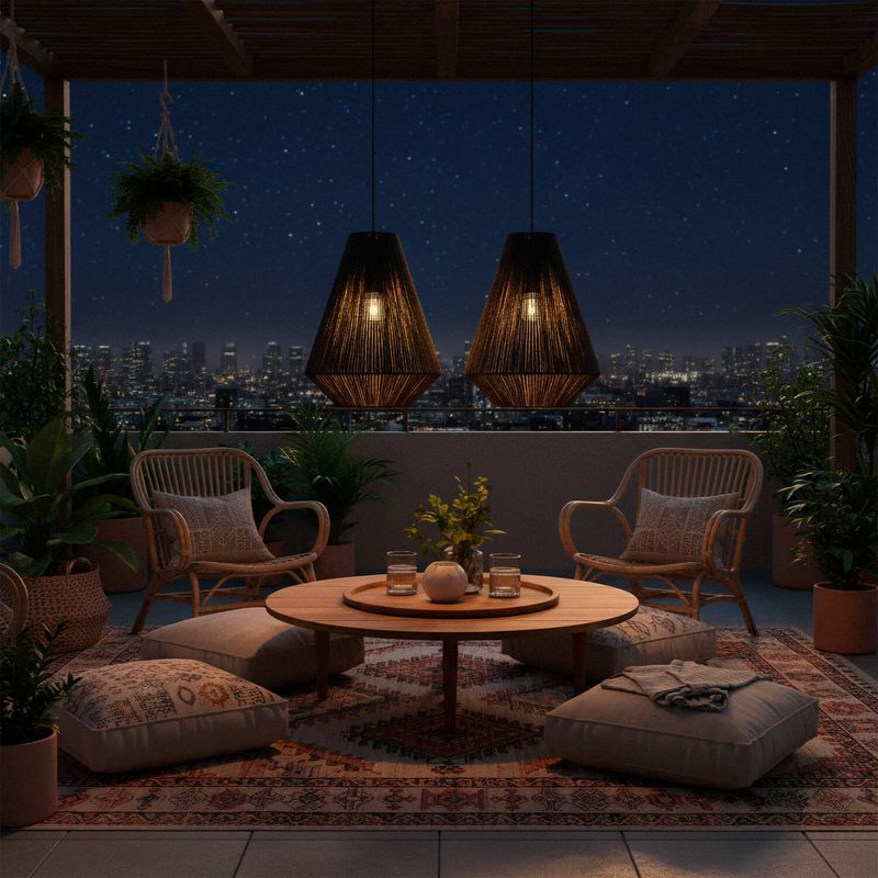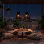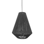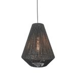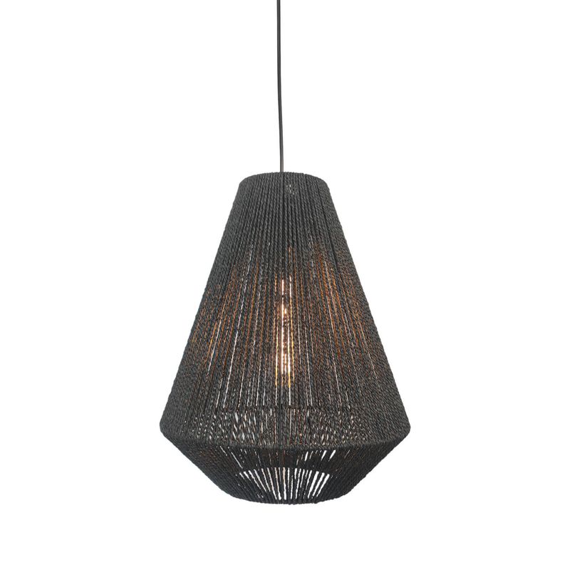 Lámpara colgante Led Studio de cuerda y papel Vietnam. Ideal para ser instalada en interiores o exteriores bajo techo como living, terrazas, quinchos, etc. Disponible en color café claro y negro. Mide Ø35 diámetro x 45 alto cm. Iluminación integrada.