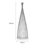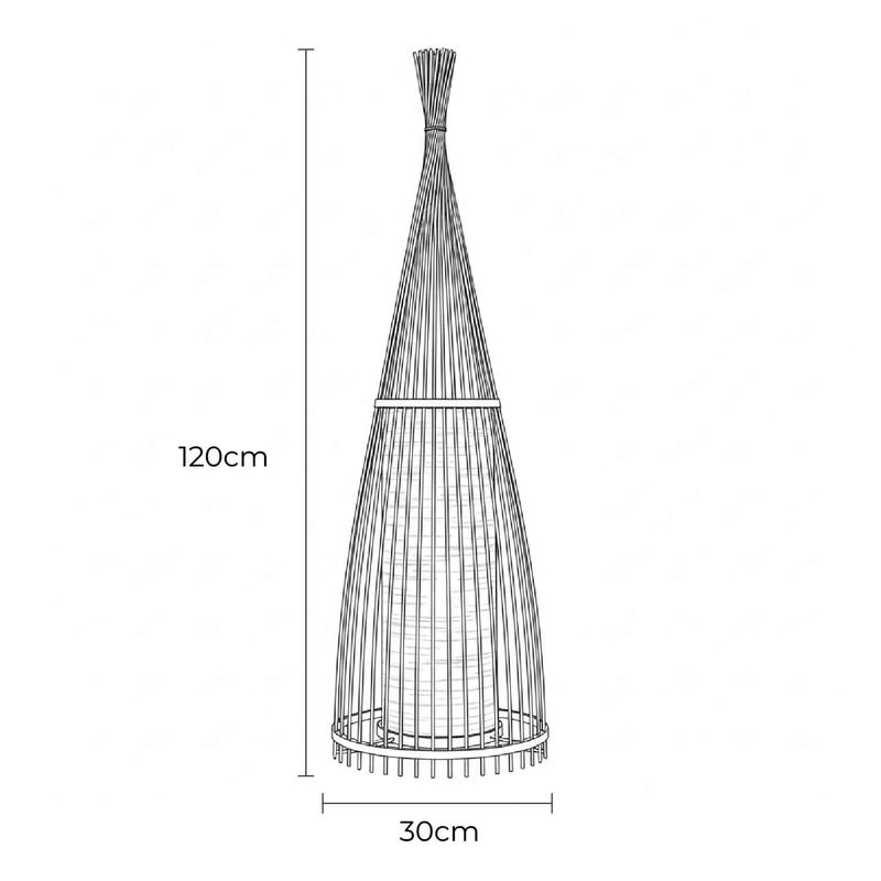Añade calidez y una textura natural única a tu hogar con la lámpara de pie de gran formato. Con una altura de 120cm, su dieseño destaca por una estructura exterior cónica de varillas de bambú que convergen en la parte superior, protegiendo un cilindro difusor interno en color arena que suaviza la luz, evitando deslumbramientos y creando una atmósfera relajante. Incluye cordón (C33500019), no incluye ampolleta.