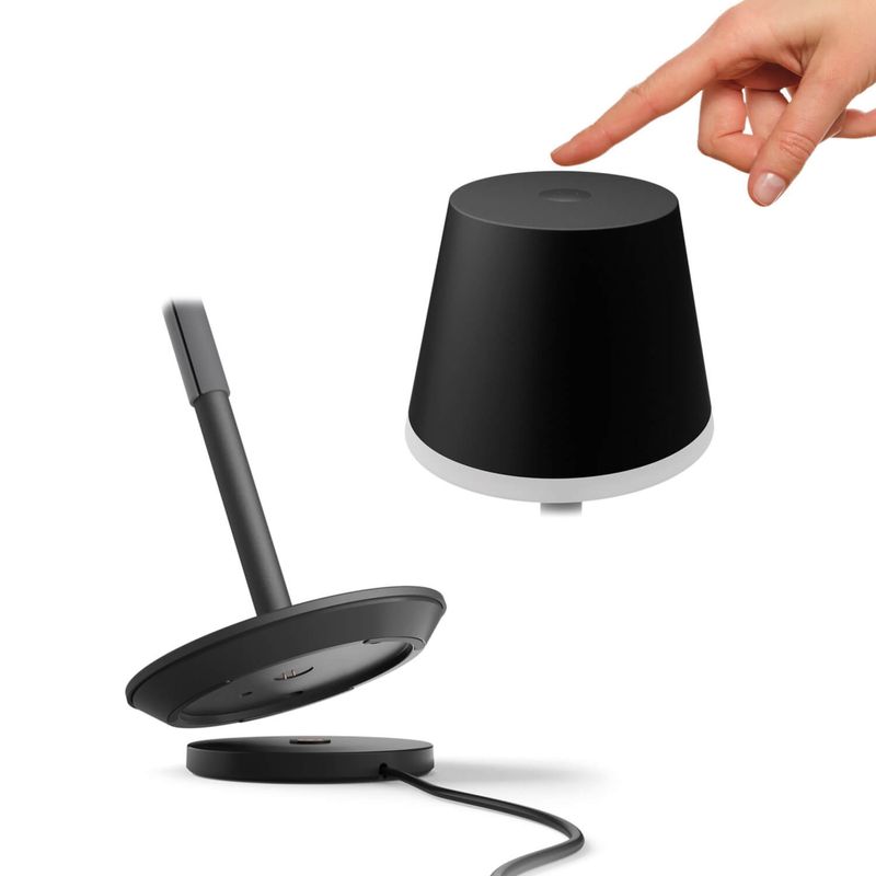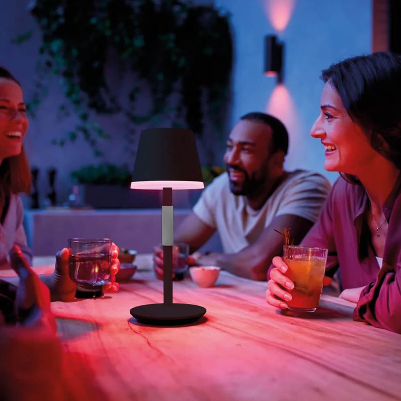 Lleva luz inteligente a donde quieras con esta lámpara inteligente portátil en color negro. Diseñada para ser usada al exterior o al interior de tu hogar, posee un agarre de silicona de color gris oscuro, es fácil de transportar a donde necesites iluminación, y puedes usarla al interior para leer o llevarla a tu terraza para disfrutar una cena.