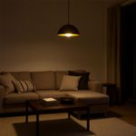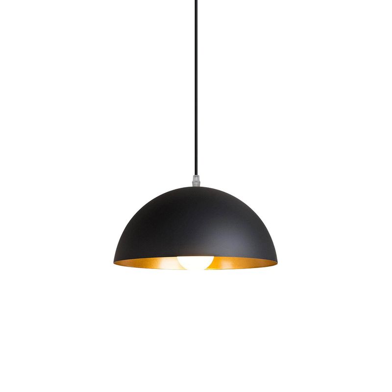 La lámpara Fénix combina un elegante exterior negro con un interior dorado que realza la calidez de la luz. Fabricada en hierro, sus dimensiones de 40 cm de diámetro y 20 cm de alto la hacen ideal para espacios interiores o bajo alero. No incluye ampolleta E27, incluye cordón (C33500019).