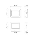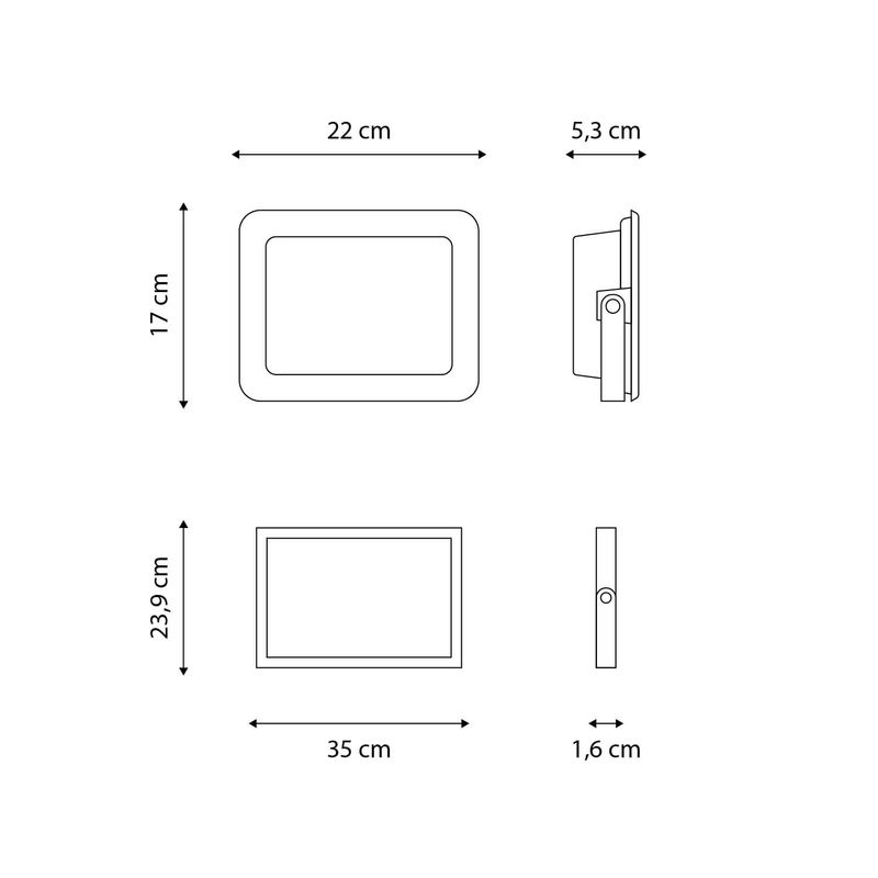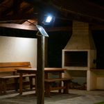 Proyector solar con batería de ferrofosfato de litio integrada en la luminaria, mando a distancia y accesorios de instalación incluidos. IP65, carcasa de plástico.